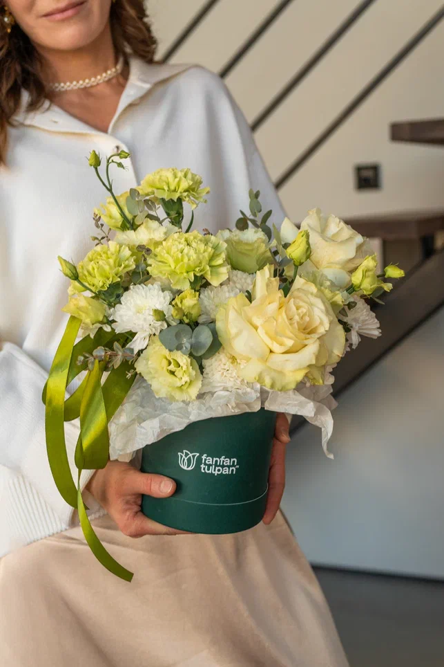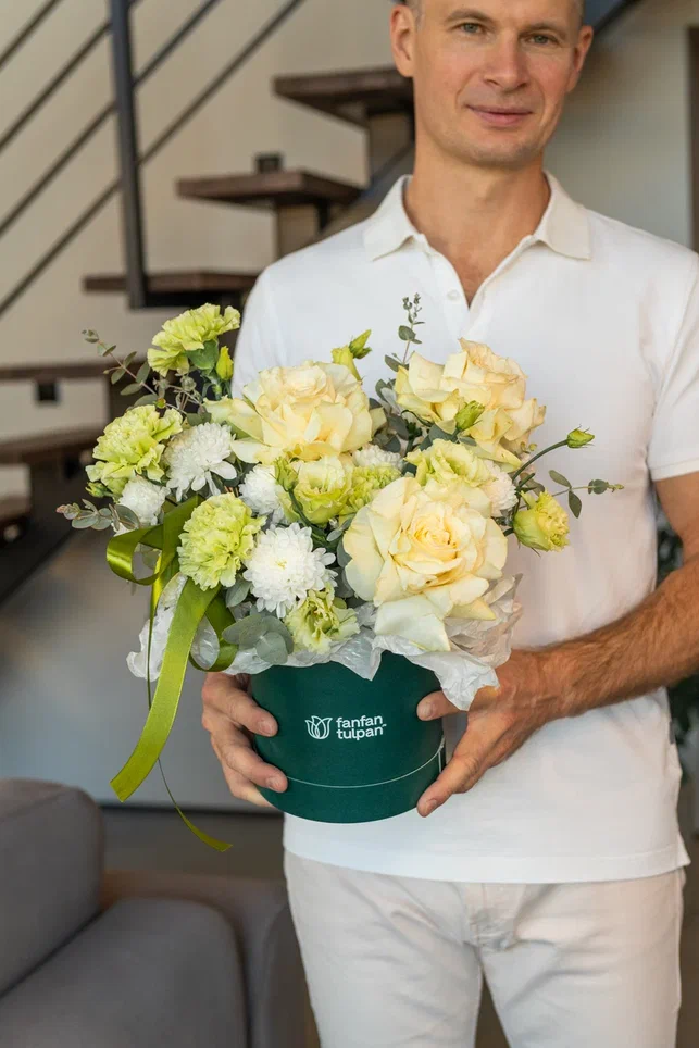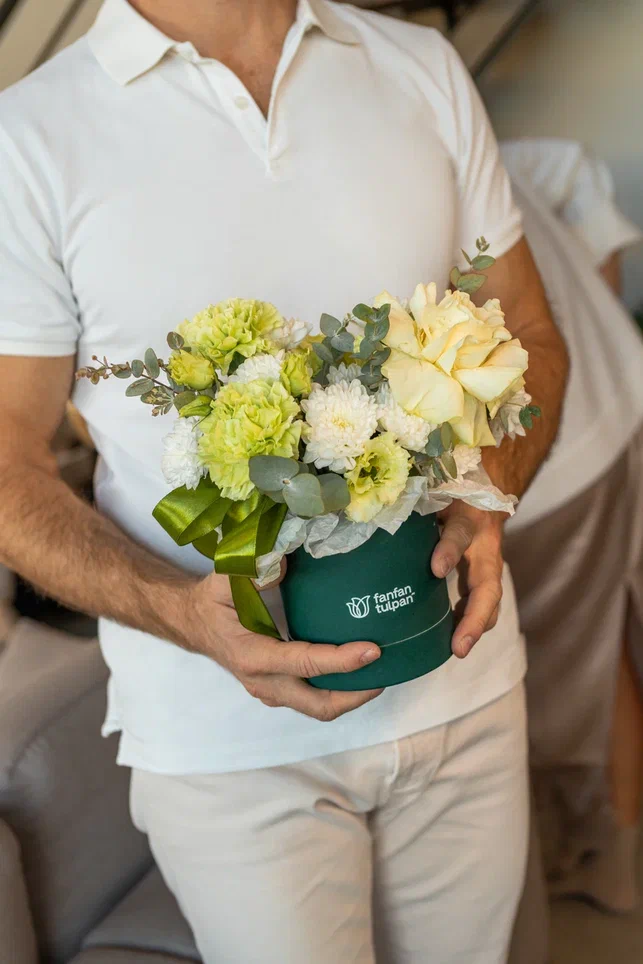 Элегантная композиция в стильной коробке - это современный флористический шедевр, где гармония форм, оттенков и текстур создает неповторимое впечатление.