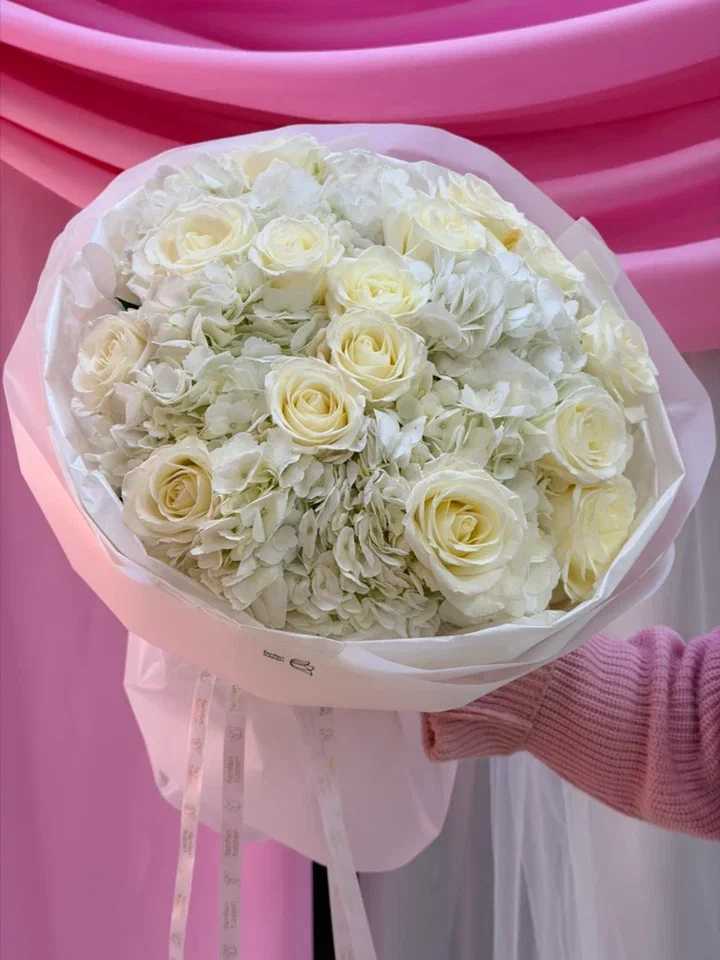 Белоснежный букет с гортензиями и розами