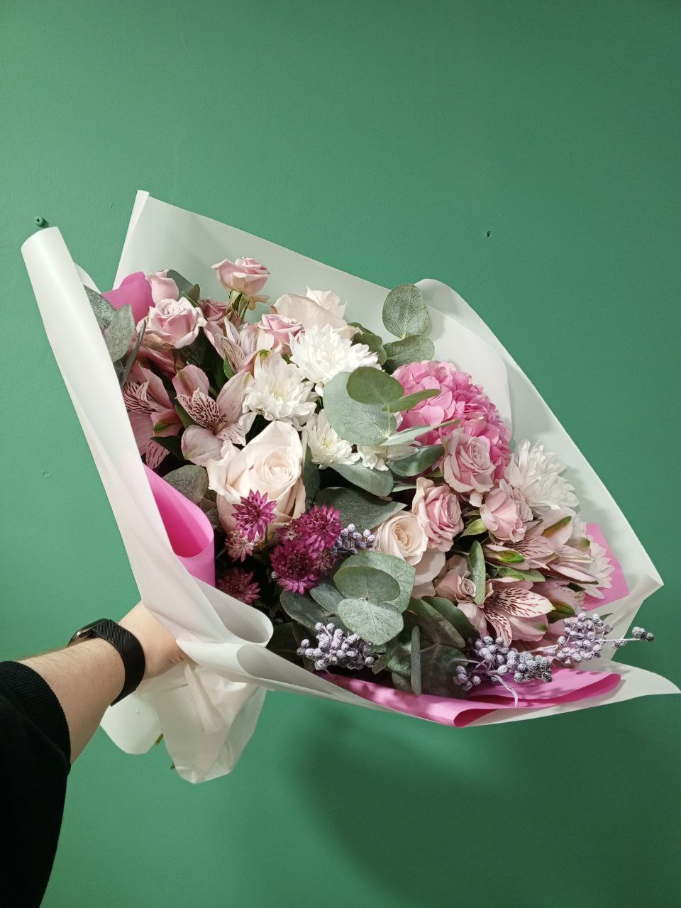 Данная цветочная композиция под запрос. Это значит что возможно у нас отсутствует какой-либо цветок в составе букета. Но мы готовы собрать похожую композицию, не чуть не менее красивую чем эта. Вы можете оставить заявку. И мы свяжемся с вами и предложим возможные варианты.
