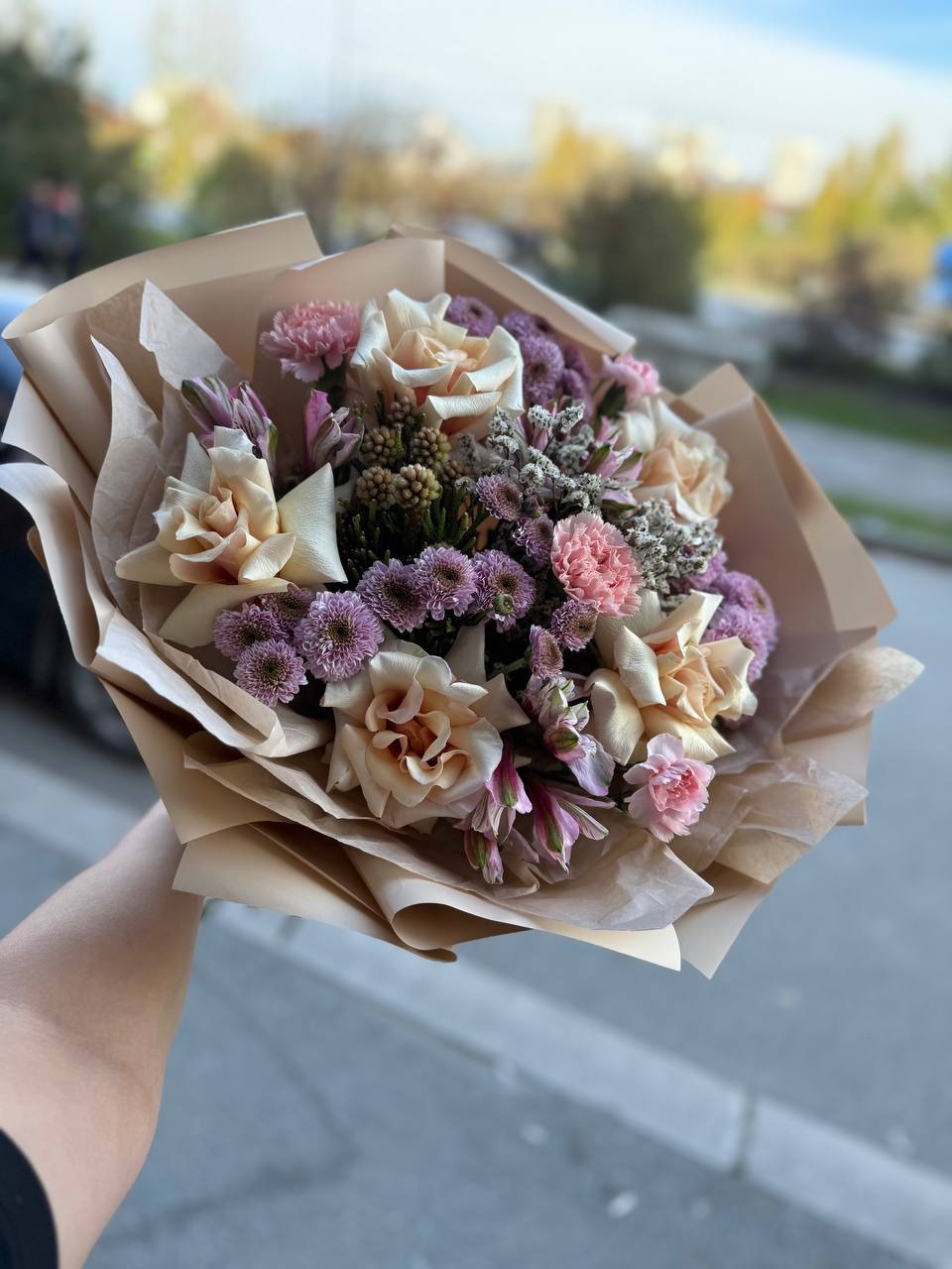 Данная цветочная композиция под запрос. Это значит что возможно у нас отсутствует какой-либо цветок в составе букета. Но мы готовы собрать похожую композицию, не чуть не менее красивую чем эта. Вы можете оставить заявку. И мы свяжемся с вами и предложим возможные варианты.