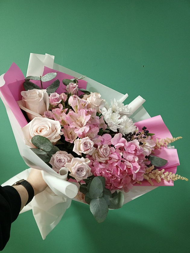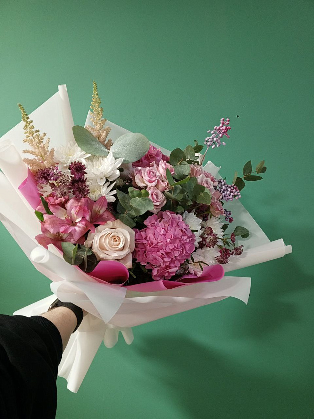 Данная цветочная композиция под запрос. Это значит что возможно у нас отсутствует какой-либо цветок в составе букета. Но мы готовы собрать похожую композицию, не чуть не менее красивую чем эта. Вы можете оставить заявку. И мы свяжемся с вами и предложим возможные варианты.