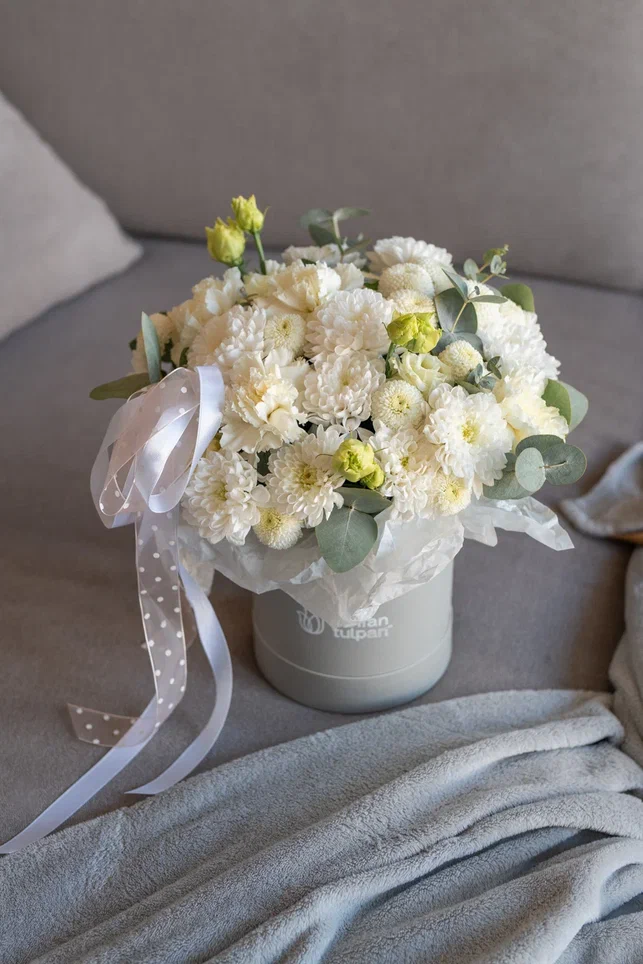 Элегантная композиция в стильной коробке - это современный флористический шедевр, где гармония форм, оттенков и текстур создает неповторимое впечатление.