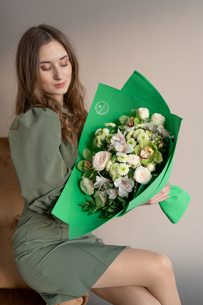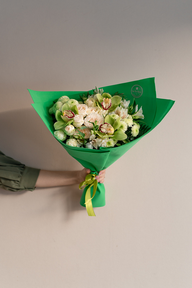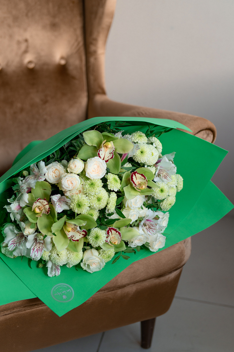 Волшебным мастерством флориста был создан непревзойденный букет, который уносит нас в мир таинственности и красоты. Сочетание зеленых орхидей, хризантем и кустовых роз превращает это произведение в истинное воплощение эстетического великолепия.