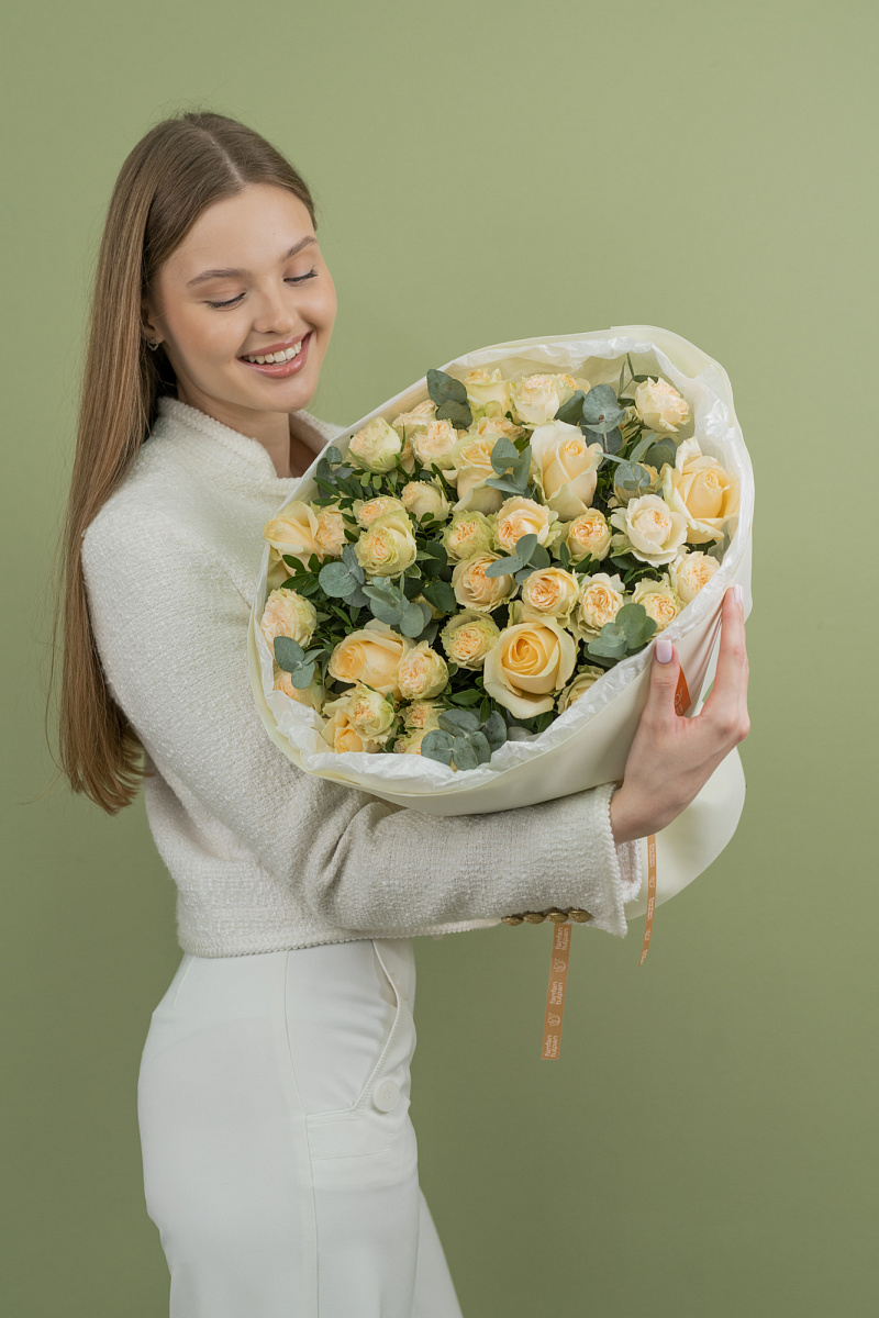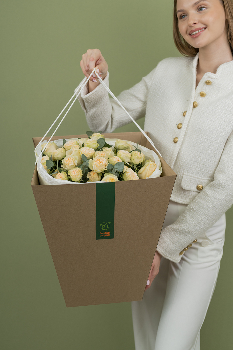 Букеты размера М,L доставляются в транспортировочном комплекте: "аквабокс + транспортировочная коробка-трапеция" или "аквабокс+фирменный пакет".
