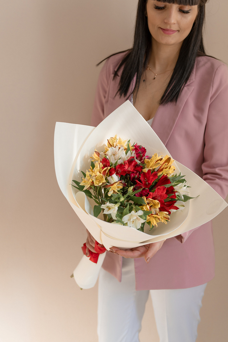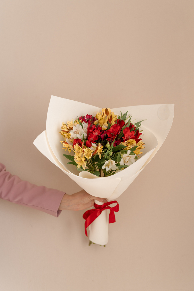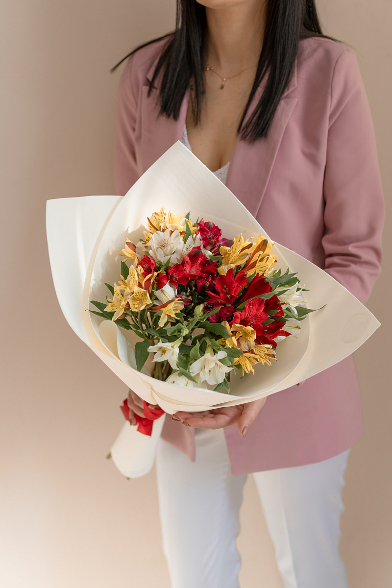 Каждый цветок этого букета выглядит по-своему прекрасно и уникально. Его лепестки, тонкие и изящные, словно созданы, чтобы демонстрировать неповторимую красоту и элегантность. Они притягивают взгляд своей симметрией и гармонией формы. И даже особая текстура лепестков добавляет этому букету неповторимости и уникальности. Каждый цветок этого букета дополняет друг друга, создавая удивительную симфонию красок.Букет из разноцветных альстромерий может выражать различные эмоции и чувства. Он может быть символом любви, идеальным подарком на день рождения или юбилей. Альстромерии, благодаря своей нежности и изысканности, подчеркивают важность момента и создают особую атмосферу праздника.