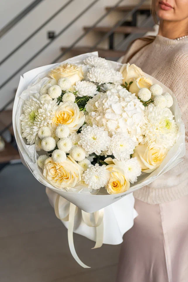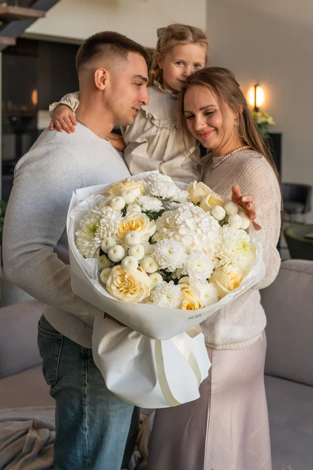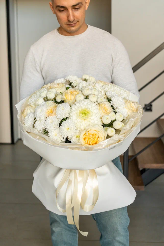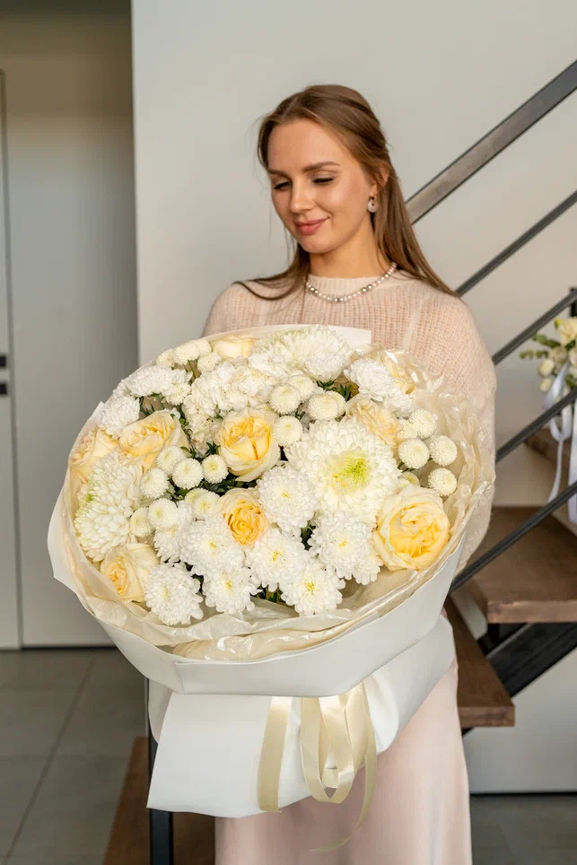 Элементы декора и расцветка цветов в выполненном букете могут иметь некоторые незначительные отличия от образца.