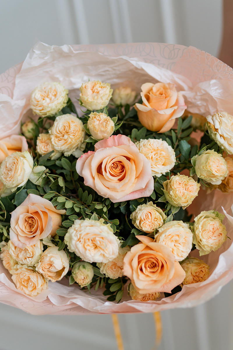 Элементы декора и расцветка цветов в выполненном букете могут иметь некоторые незначительные отличия от образца.